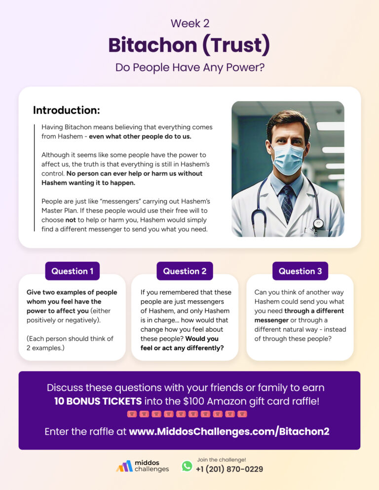 In addition to the daily challenges, you’ll get 1 discussion sheet each week, with a brief lesson about Bitachon and 3 questions to discuss with your family or friends.